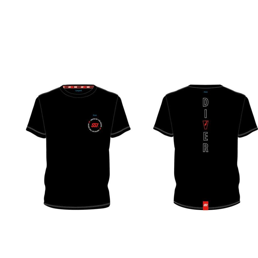 Classic and stylish, this black round-neck T-shirt features a bold white "Diver" print on the front. A sleek and timeless look for diving enthusiasts.